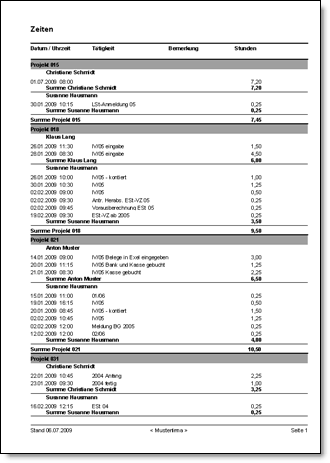Die eingegebenen Arbeitszeiten lassen sich auf vielfältige Weise zu Papier bringen. Erstellen Sie Listen für die eigene Dokumentation, als Anhang zu einer Rechnung oder vielleicht bevorzugen Sie den klassischen "Stundenzettel".